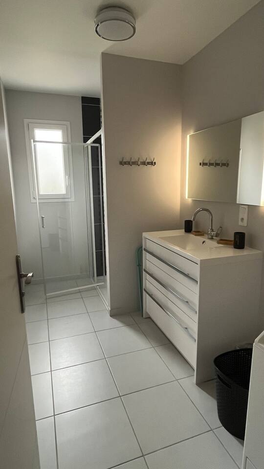 La maison dispose d’une salle de bain avec douche adaptée PMR, de toilettes PMR, ainsi que d’équipements pour bébé (chaise haute, lit parapluie, baignoire).